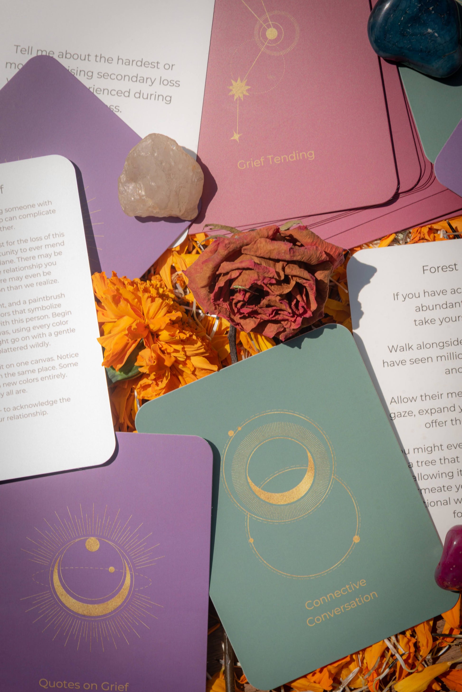 Planet Grief is a resource for grievers and the people that love them. In this deck you will find rituals and somatic practices to support connection, grounding, and release. You will find words of wisdom on grief that evoke a sense of understanding and communion. This deck also offers structure around those difficult conversations on grief and loss that so many of us hesitate to have. It provides helpful conversation tips for listeners as well as 21 questions to support individuals in bridging the gap of connection after loss.